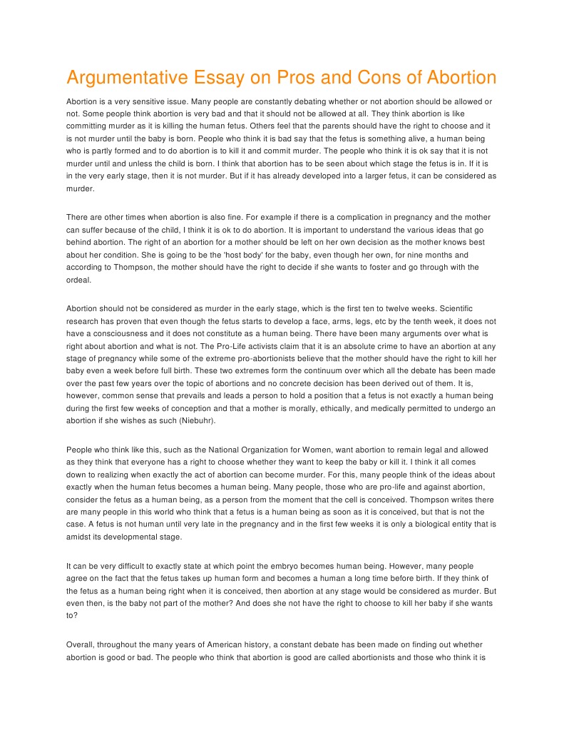 In addition, the pro-life argument that a fetus feels pain during the procedure of abortion is less convincing, argumentative essay about abortion. It may be that the reason a mother is terminating a pregnancy is to prevent the yet to be born child from facing the pains of the world.